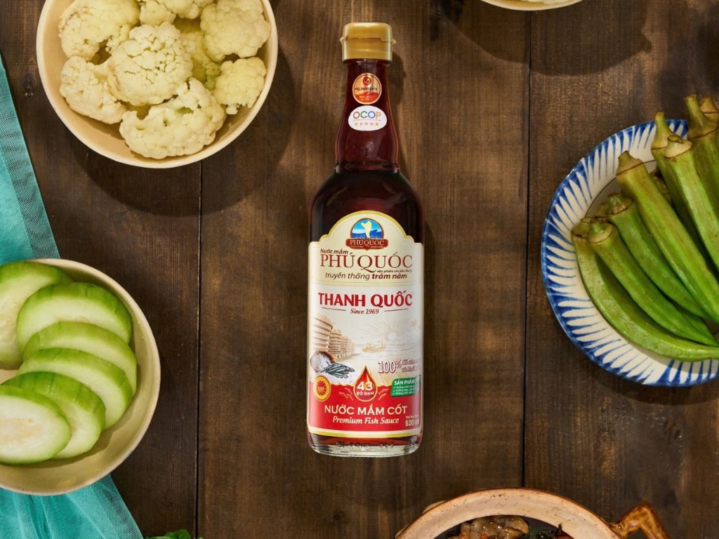 Nước mắm Chỉ dẫn địa lý Phú Quốc – Thanh Quốc 43 được làm từ cá cơm tươi vùng biển Phú Quốc kết hợp với muối Bà Rịa – Vũng Tàu, ủ chượp trong thùng gỗ và lên men tự nhiên 12–15 tháng theo tỷ lệ vàng 3 cá : 1 muối. Sản phẩm giữ trọn sự thuần khiết, không chất bảo quản, không chất điều vị, mang hương vị đậm đà chuẩn truyền thống.